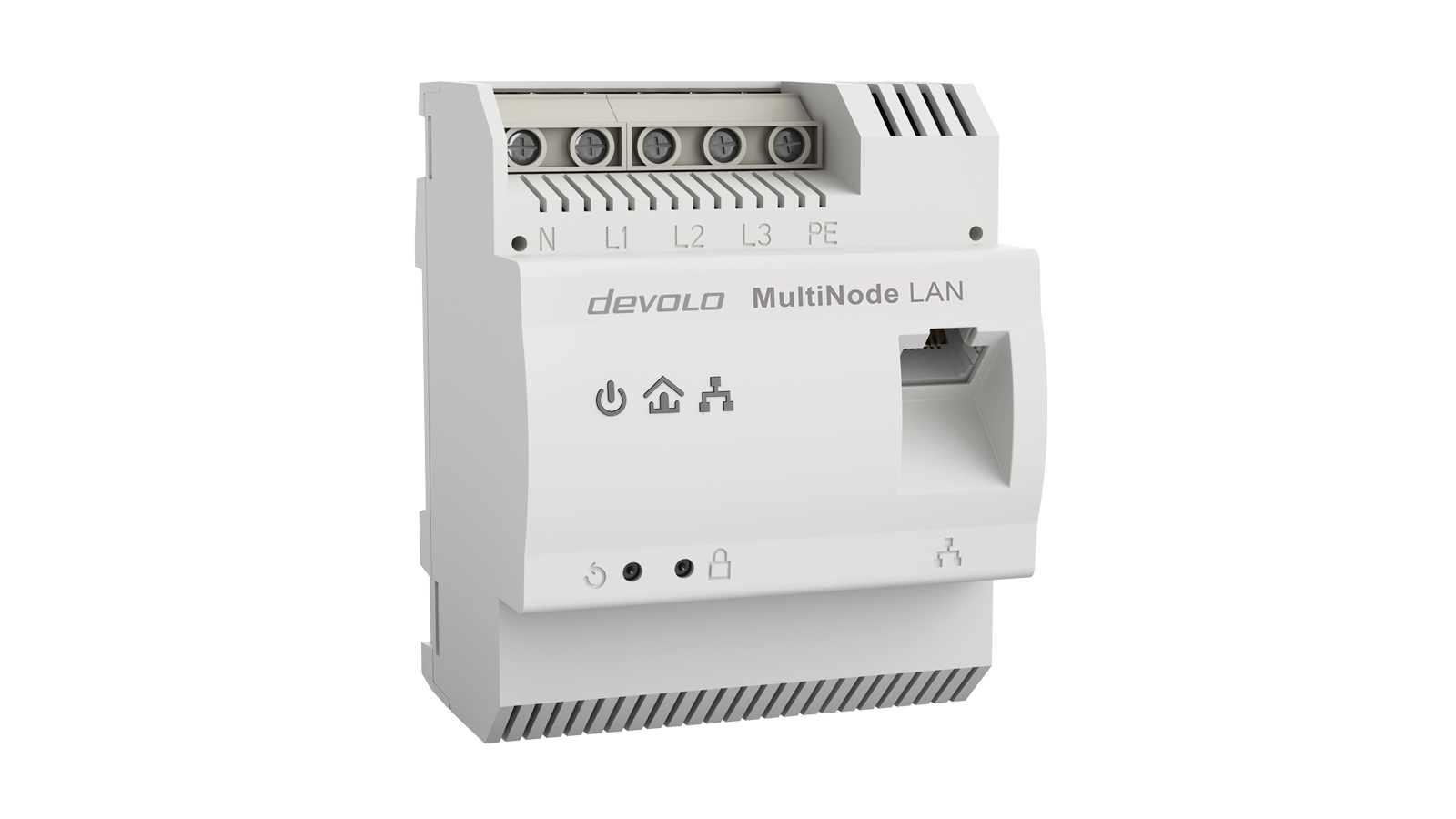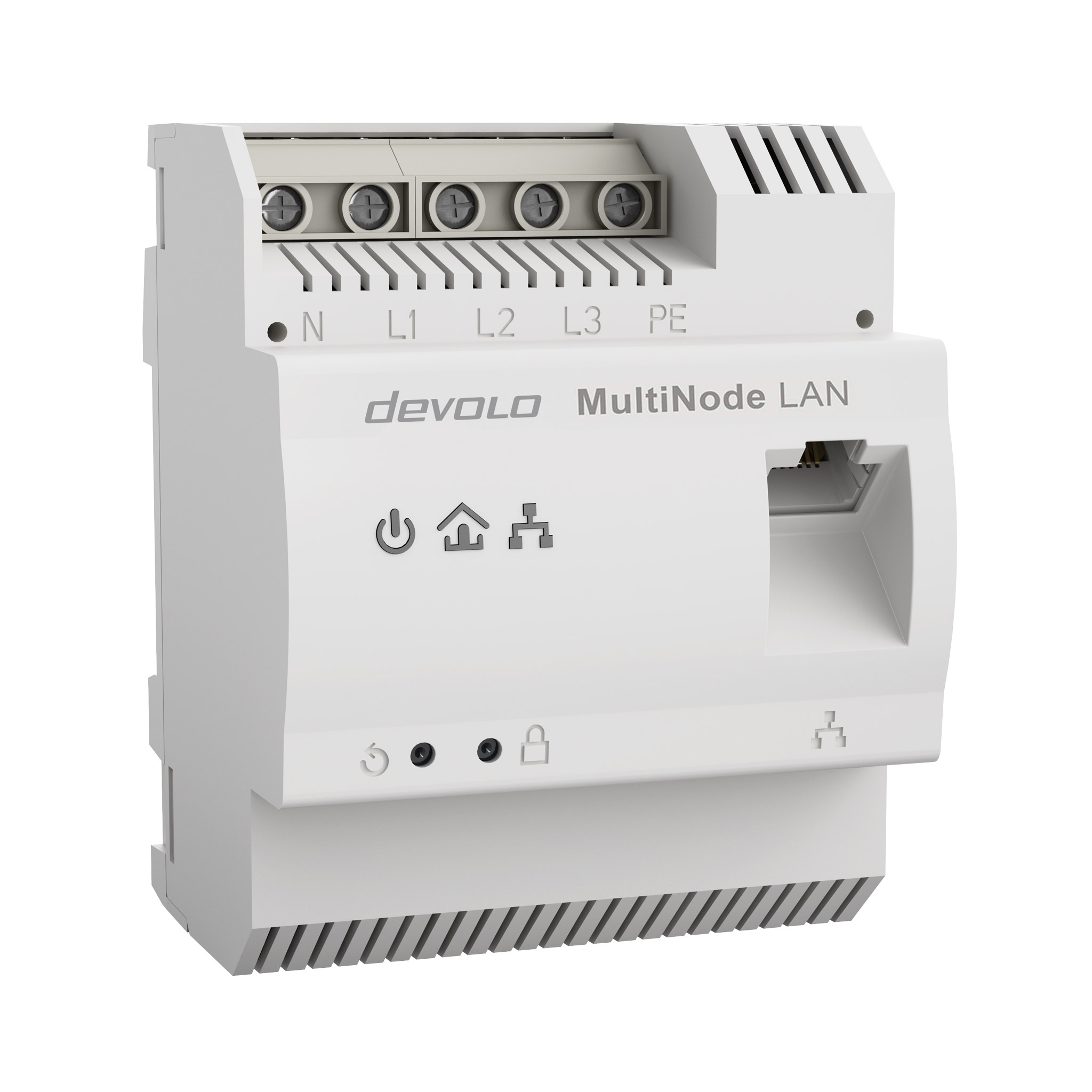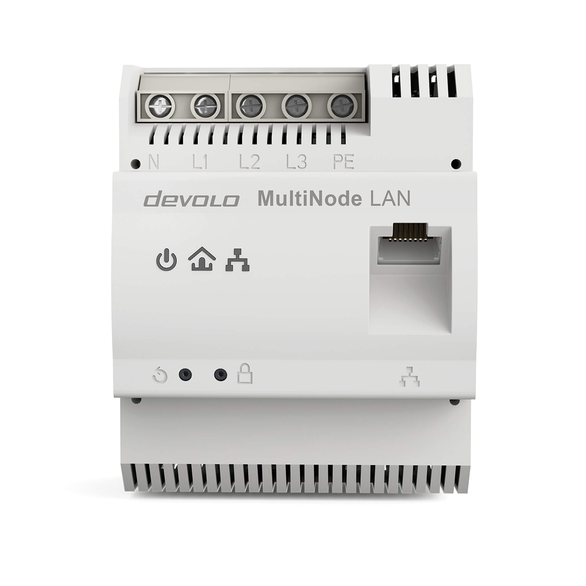 The devolo MultiNode LAN utilises the busbar or the power cable for data communication. The network connection of the central MultiNode LAN device is established via Ethernet to a gateway or directly to the energy management system. The distributed MultiNode LAN devices at the charging stations also have an Ethernet interface.